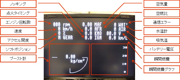 本製品は、ECUが持っている情報を表示するものです。モニタ表示がおかしく、自動車に標準搭載されているセンサに問題があると考えられる場合には、自動車整備工場などで修理を行ってください。