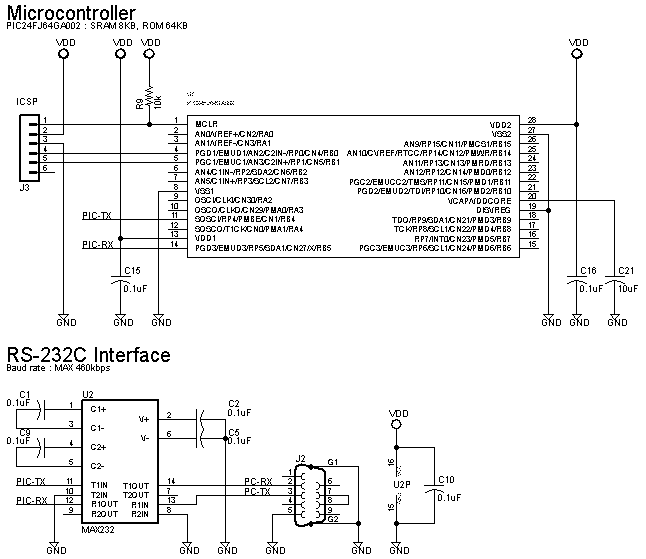 PIC24Fの場合は、TXD/RXDをそれぞれ RPピンへ接続します。その後、ファームウェア側で RPピンに TXD/RXDの機能を設定します。したがって、RPピンであればどこに接続してもよく、非常に回路が組みやすくなっています。 PIC24Fの場合は、UARTの TXD/RXDをそれぞれ RPピンへ接続します。その後、ファームウェア側で RPピンに TXD/RXDの機能を設定します。したがって、RPピンであればどこに接続してもよく、非常に回路が組みやすくなっています。