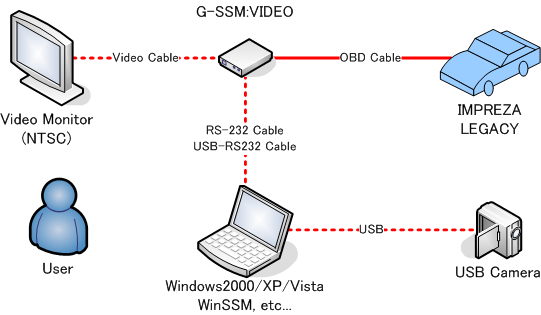 Subaru Select Monitor for Gadget G-SSM:VIDEO Ver 6.5(以下、G-SSMと呼ぶ)は、自動車のエンジン回転数、車速、瞬間燃費、シフトポジション(マニュアル車の場合)、ブースト圧、水温、吸気温、バッテリー電圧、スロットル開度、エンジンの点火タイミング、ノッキング状態をビデオ出力する装置です。また、RS-232CケーブルまたはUSB-RS232変換ケーブルを PCの COMポートまたは USBポートに接続することで、これらの状態をロギングできます。ビデオ出力やログ出力は、それぞれ併用または片方のみ使用することができます。