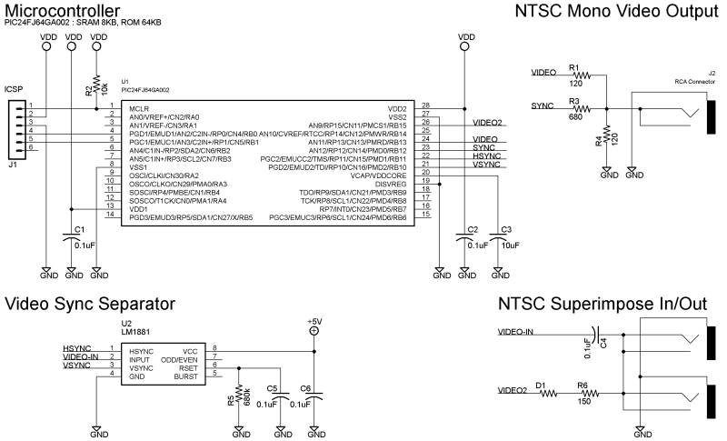 ビデオドライバは、モニタ出力 (通常の NTSC出力) とスーパーインポーズ出力に対応しています。スーパーインポーズ出力を行う場合は、外部のビデオ信号が必要となります。PIC24F内蔵の割り込みを使っているため非常に高速に描画することができ、フォアグラウンドの処理を邪魔しません (まさに OpenSSMが良い例でしょう)。また省電力機能にも対応しており、ビデオ表示を行いながら動的に CPUクロックを上げる/下げることもできます。